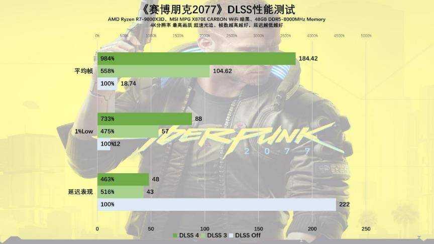 具体到每一款游戏,先看看显卡杀手《赛博朋克2077》,自从这款游戏加入了路径追踪后,RTX 50系之前的所有显卡都很难说稳吃这款游戏,这个状况随着DLSS 4的出现迎来了转变,平均帧率上面已经提到了,我们看看1%帧,没开DLSS 4之前游戏基本处于不可玩的状态,开启后1%帧暴涨到88 FPS,已经足以流畅运行了,延迟更是降至48ms,稍稍高于DLSS 3,说明多帧生成相比帧生成,在控制延迟方面表现良好。