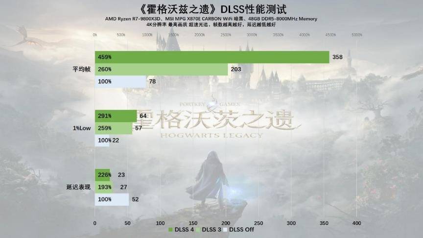 再看看《霍格沃兹之遗》,从DLSS OFF的1%LOW帧数据来看,索泰GeForce RTX 5080 SOLID OC即便不借助任何DLSS技术也能流畅游玩,有了DLSS 4更是如鱼得水。鉴于这款游戏的平均帧率有保障,追求画质的玩家甚至可以考虑将帧生成的数量调低,以获得更接近原生的游戏画面。