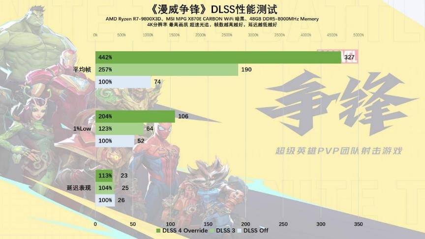 最后是喜闻乐见的《漫威争锋》,作为一款竞技类网游,如果帧率太低在排位赛是要吃大亏的,而这款游戏偏偏又很吃硬件配置,强如索泰GeForce RTX 5080 SOLID OC,在未开启DLSS时,1%LOW仅为64FPS,平均帧率仅为74FPS,说它是网游界的硬件杀手是一点不过分。好在现在有了DLSS 4,同一张卡的平均帧率突破了300FPS,这流畅度足以赢在起跑线。