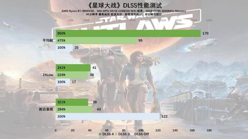 接着是《星球大战:法外狂徒》,这款新作同样是先进图形技术拉满,未开启DLSS的1%LOW帧数据就表现得淋漓尽致了,DLSS 4再次化腐朽为神奇,将一款画质拉满时完全无法游玩的游戏变得流畅运行,平均帧率甚至能喂饱4K@144的电竞显示器。