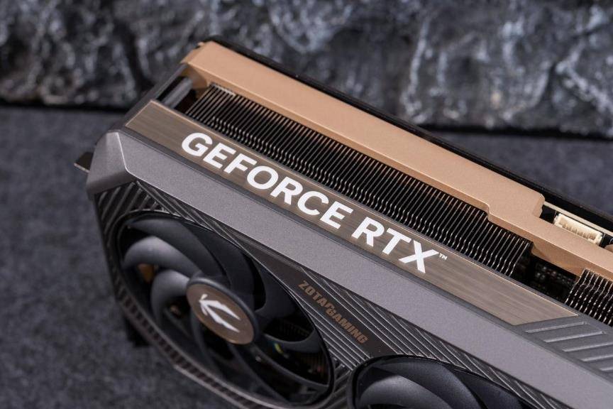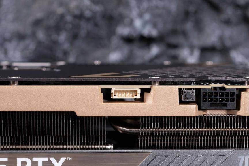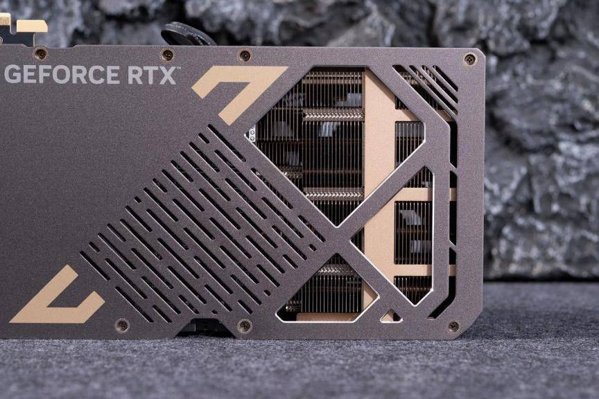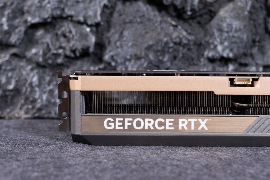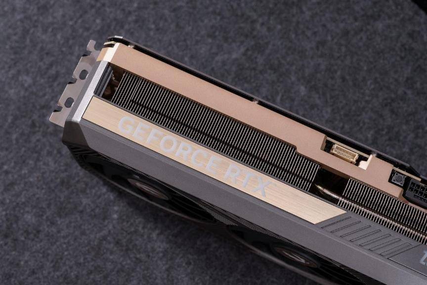 近年英伟达的营销物料越来越喜欢用香槟金配色,位于散热器侧边的GEFORCE RTX标识被放置在香槟金底色之上,以此跟进英伟达的设计潮流。