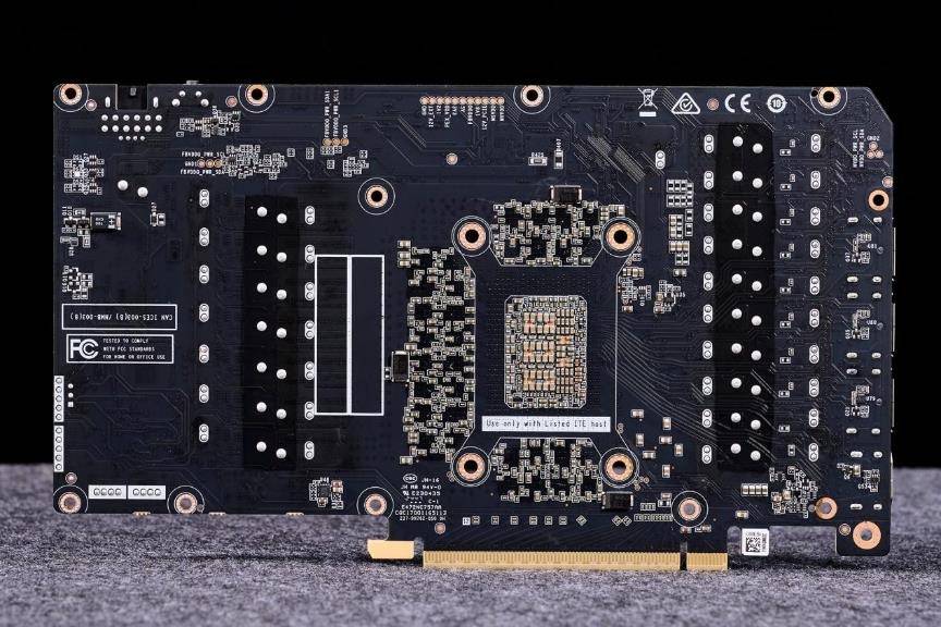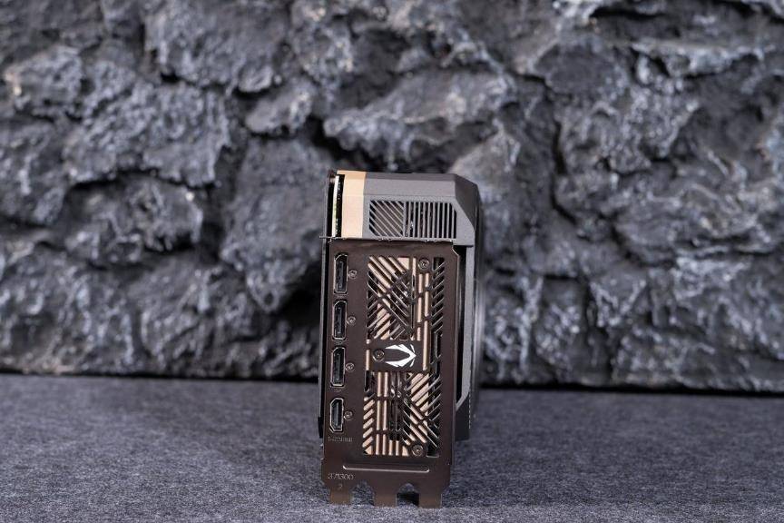 翻到IO挡板能看到4个视频输出接口,包含3个DP以及1个HDMI,不过具体的接口型号却大有来头,采用了DP 2.1b以及HDMI 2.1b规格,这就意味着这张卡支持输出最高4k 480Hz和8K 165Hz的画面,目前支持这个规格的显示器都是极度前沿的旗舰产品,可以说这个显卡在视频规格上就颇具“战未来”的意味。