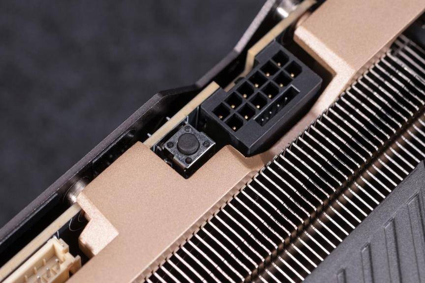 该卡采用12V-2x6供电接口,接口上方其实还设有一枚电源指示灯,接口旁边为双BIOS切换开关。