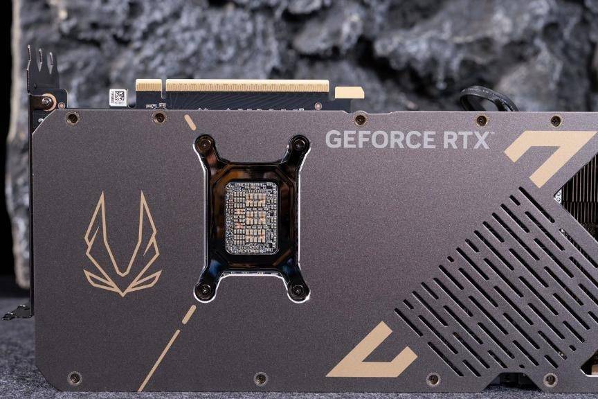 索泰 RTX 5080 SOLID OC的背板设计让人印象深刻,上面只有LOGO和镂空的散热孔,但是经过简单的金色线头勾勒,依然营造出气派氛围。