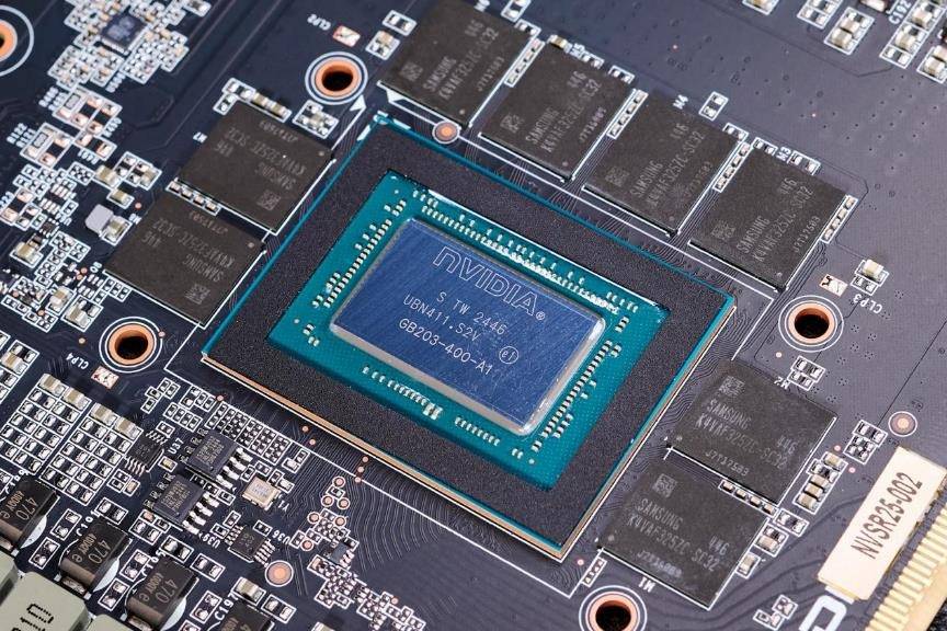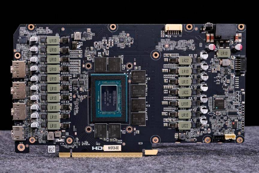核心四周的8枚显存芯片十分醒目,结合索泰 RTX 5080 SOLID OC拥有16GB显存容量来看,单枚显存芯片的容量为2GB,高密度的显存芯片能有效降低PCB布线的复杂度,让PCB看上去更美观。