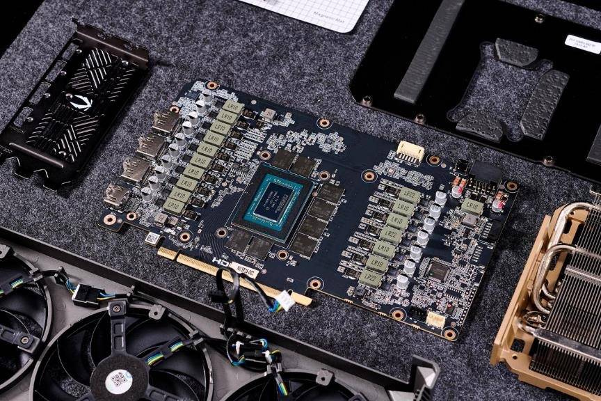 所以接下来当然就是拆解环节了,一起看看这个卡是否内外兼修吧。还记得老黄在CES 2025上展示了RTX 5090/5090D的小巧PCB,作为次旗舰版本,索泰 RTX 5080 SOLID OC的PCB同样小巧,与三槽越肩式设计的散热造型形成了强烈反差。
