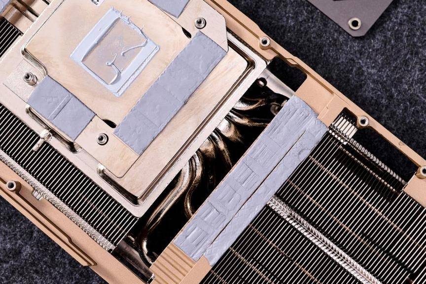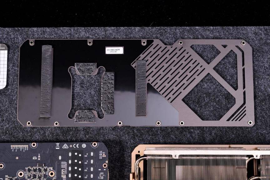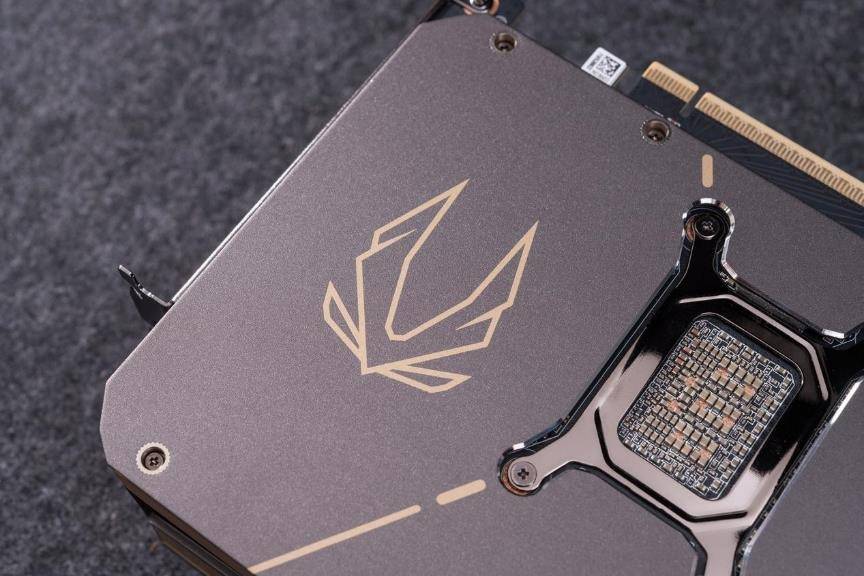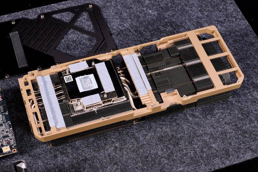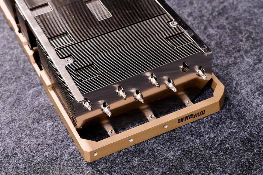 在背板与散热器之间,索泰埋了一整块用于加强显卡结构的香槟金色合金中框。