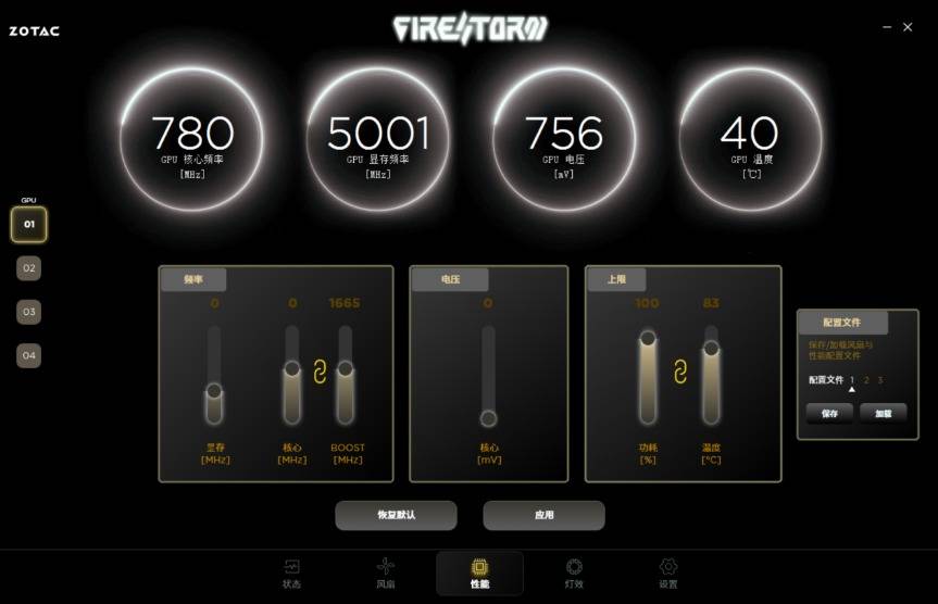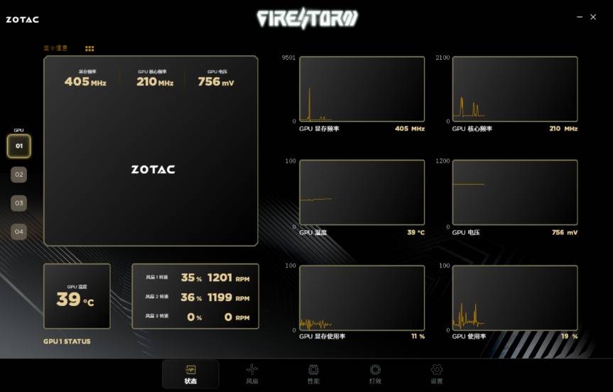 提起索泰显卡自然难免要提及他们家的Firestorm超频软件,现在它已经被升级到5.0版本,我们体验了一下,现在通过Firestorm 5.0软件,我们既能监控到显卡的概况、设置显卡灯效。