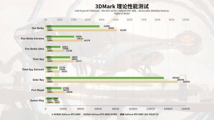 接下来跟大伙分享该卡的理论性能详解,理论性能咱们主要参考3DMark基准。先来看3DMark的情况,在Fire Strike的基准测试中,索泰GeForce RTX 5080 SOLID OC领先RTX 4080 SUPER的幅度在23%上下;到了DX12的Time Spy测试中,这个幅度差别在16%左右;在对显卡压力最高的Speed Way基准中,新卡领先幅度又回到了21.4%。