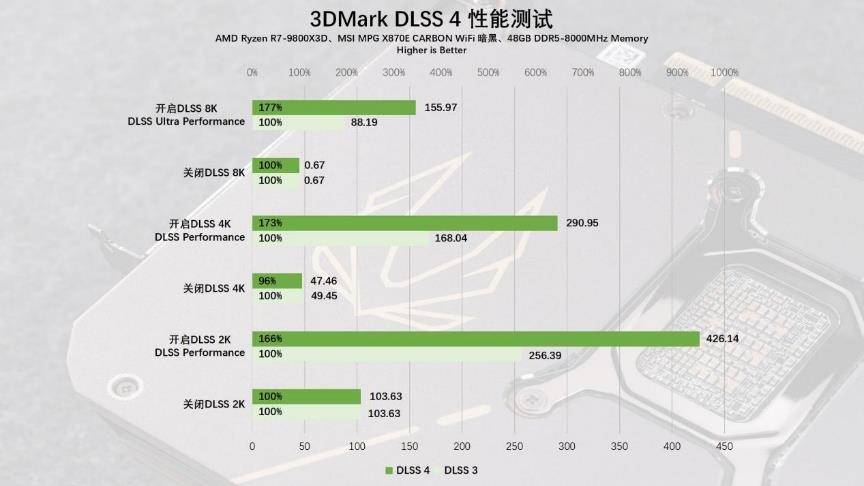 3DMark已经第一时间加入了DLSS 4的对比测试内容,从理论性能角度来看,DLSS 4所带来的提升十分明显,4K分辨率下,DLSS 4相对DLSS 3的帧率进一步暴涨,相比原生帧率提升了6倍之多,8K分辨率的情况就更夸张了,以至于我们还觉得难以置信,8K样例的平均帧率高达156FPS,这只能用性能炸裂来形容。