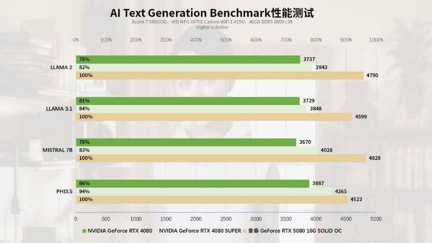 再来看另一个AI基准——AI Text Generation Benchmark,这是一个集合了PHI 3.5、LLAMA 3.1、LLAMA 2等多种大语言模型的基准测试软件,可以很好地评估和对比不同显卡处理不同模型的能力。从实测结果来看,索泰GeForce RTX 5080 SOLID OC的表现可圈可点,除了PHI 3.5外,其他基准对比RTX 4080 SUPER均具有20%左右的领先,相信随着以后FP4精度模型的推广和普及,RTX 50系的优势会越来越明显。