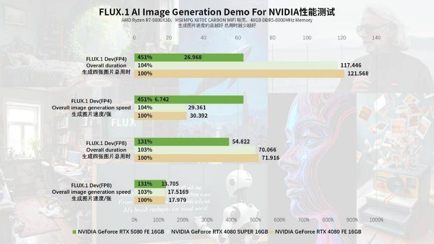 我们用FLUX.1 AI Image Generation Demo For NVIDIA基准软件验证,实测结果非常清晰地展示了FP4的魅力。在FP8精度下,三张显卡的性能接近,索泰RTX 5080 SOLID OC稍强。到了FP4精度,它们的性能差别肉眼可见,RTX 4080 SUPER需要将近半分钟才能生成一张图,而索泰RTX 5080 SOLID OC仅需10秒。