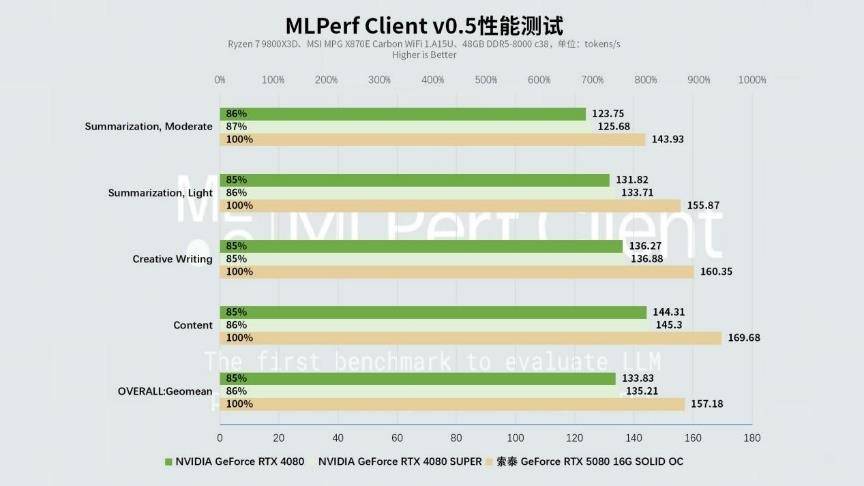 再来看看MLPerf Client v0.5,这项AI基准更倾向于实际应用场景,比如针对创意写作、长文摘要等场景的测试,实测索泰GeForce RTX 5080 SOLID OC的领先幅度依然较为明显。