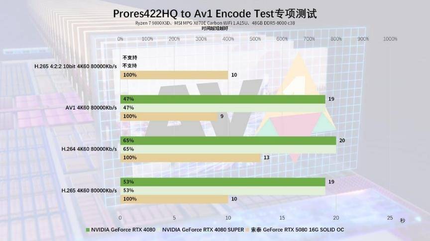 实测结果着实让人印象深刻,索泰GeForce RTX 5080 SOLID OC导出这三条不同格式的4K视频用时几乎是RTX 4080 SUPER的一半。而且正如前面所言,它还支持编码4:2:2色度取样的视频,实测结果也十分高效。更重要的是,有了这项新特性,索泰RTX 5080 SOLID OC不但能为创作者节省大量时间,更能帮助创作者轻松输出更高清无损的视频样例,这是以往40系显卡都无法做到的。