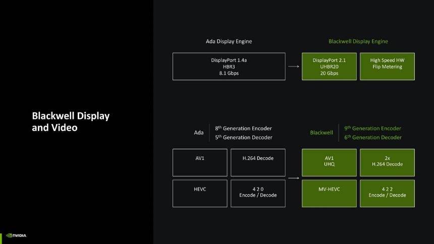 第三点改变则是显存效率的提升,Blackwell架构中还首次加入了对GDDR7显存的支持,此前GDDR6显存的信号编码为NRZ/PAM2,而RTX 40系上的GDDR6X则是PAM4编码。最新的GDDR7显存,信号编码改成了PAM3,NRZ/PAM2每周期提供1位的数据传输,PAM4每周期提供2位的数据传输,而PAM3每两个周期的数据传输为3位。说人话就是,新的编码机制可以使杂讯失真比减小,信号品质更清晰,同时还能带来更高的显存运行频率以及更低的电压,根据NVIDIA的介绍,使用GDDR7显存后,数据传输速率可达GDDR6时的2倍,并且功耗接近GDDR6的一半,经典加量还减价。