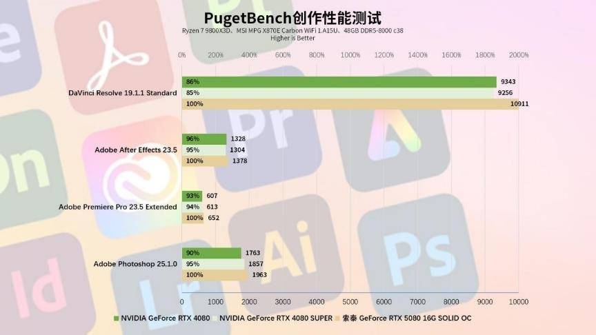 再来看看更理性的Pugetbench创作力跑分基准测试,在几款Adobe基准中索泰RTX 5080 SOLID OC的代际提升幅度基本与CUDA规模提升幅度吻合,这显然是早期驱动还在适配中。在达芬奇软件的测试基准中,索泰RTX 5080 SOLID OC的代际提升幅度来到了15%左右,相信未来经过打磨的驱动版本上线后,代际提升还会更明显。