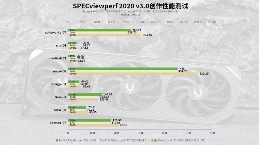 最后是喜闻乐见的工业领域专用软件基准SPEC2020,这项基准测试涵盖了市面上多个工业级生产力软件,能一定程度上反映出显卡的工业生产水平。实测除了极个别软件外,索泰GeForce RTX 5080 SOLID OC都有待机提升,而且提升幅度在6%到27%之间,日常工作有使用到这些软件的小伙伴可以酌情参考升级显卡。