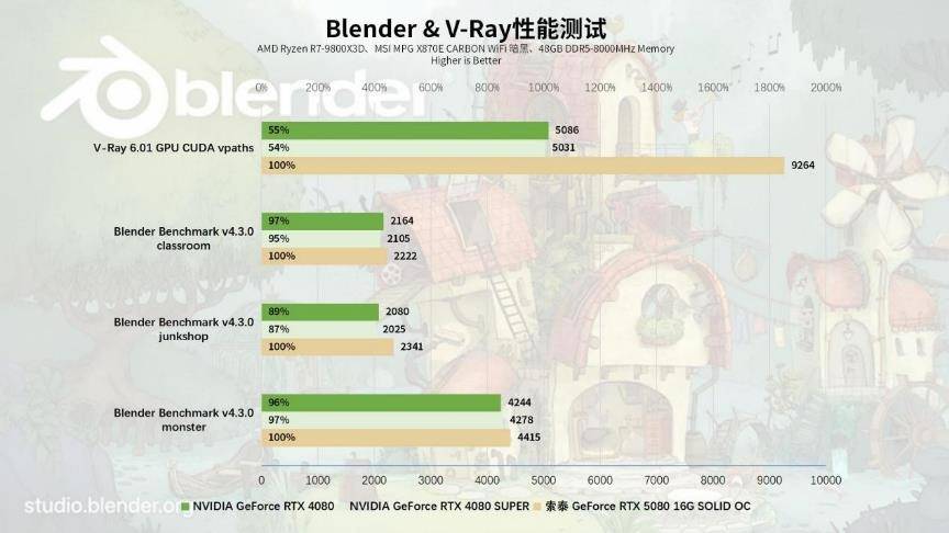 接着是3D渲染软件的性能评估,我们选择了Blender与V-Ray的基准测试。实测索泰GeForce RTX 5080 SOLID OC在这几个3D渲染基准中平均领先RTX 4080 SUPER大约17%,同样是考虑到两者的CUDA规模差距,个别项目的提升幅度基本合理。