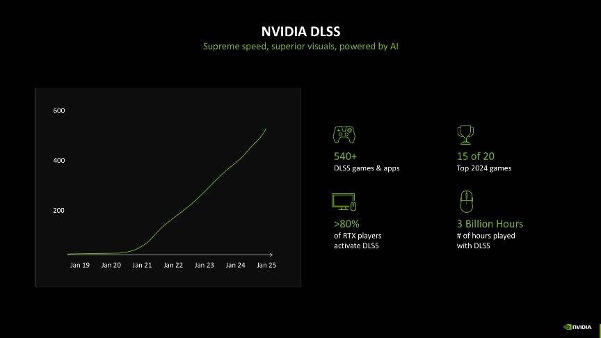 介绍完NVIDIA引以为傲的RTX神经网络渲染,再让我们看看应用RTX神经网络渲染的最好例子——DLSS。它不仅能提高帧率,还可同时提供清晰锐利的高质量图像,效果与原生分辨率渲染媲美。目前支持DLSS的游戏和应用已经超过540款,而玩家使用DLSS的时间更是长达3亿个小时,可以说DLSS给玩家带来了划时代的游戏体验。