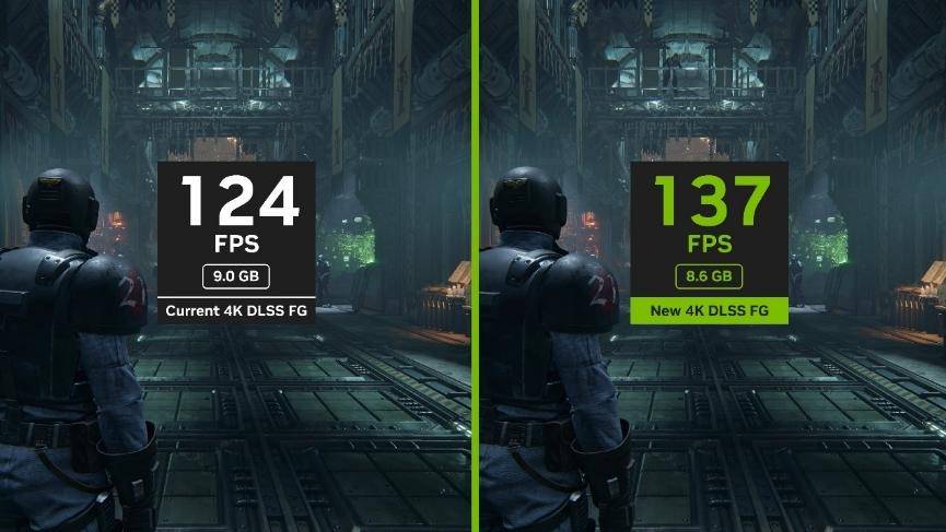 同时得益于多帧生成功能是利用效率极高的AI模型,相较于上一代的硬件光流器进行帧生成的方式,能够显著降低生成额外帧的计算开销。反映在显示中就是能够节约显存占用,例如在《战锤 40 K:暗潮 》中,以4K最高设置游玩,DLSS 4不仅可将帧率再提升10%,还能将内存占用量减少400 MB。