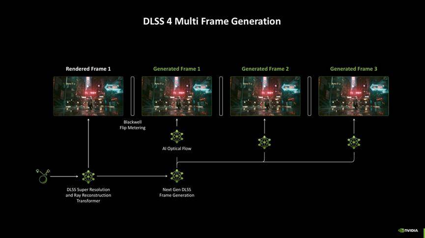 最大的变化当然是DLSS 4,相比于DLSS 3的帧生成功能,DLSS 4的多帧生成可以渲染一帧同时最高生成三帧,这已经是非常强力的一个表现。相比上一代, Blackwell的帧生成模型快了40%,显存占用降低30%。如果说得更直观一点,在多帧生成4×的时候,等于GPU传统渲染工作占了1/16,而其他15/16则是由AI来负责,这不得不让人感叹AI在当下游戏领域中的含金量。
