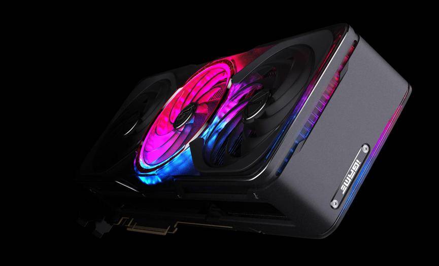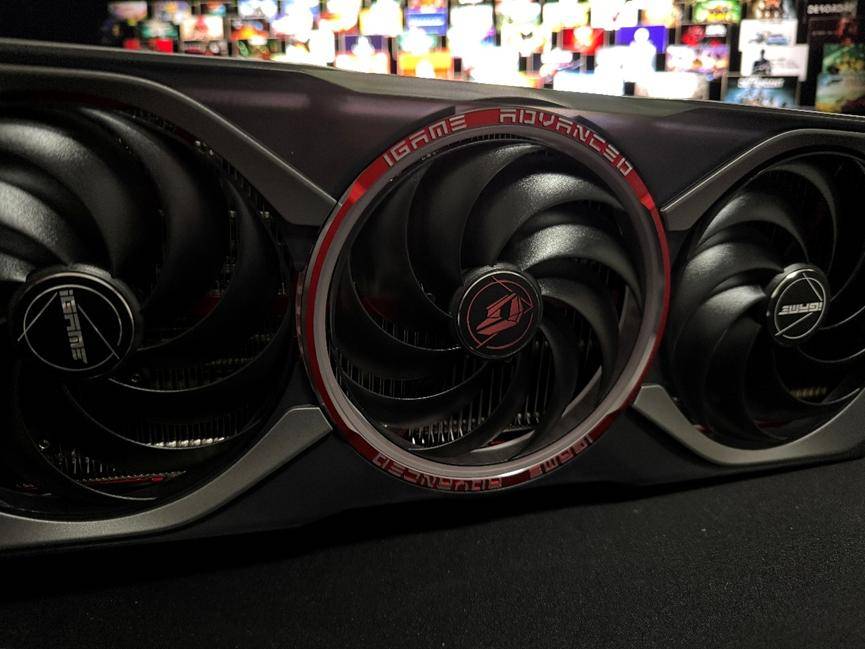另外在光效部分,七彩虹iGame RTX 5080 AD OC也有自己独到之处,双环RGB灯组配合全新的磨砂黑透外甲,带给视觉很刺激的灯光感受。最有意思的是,在显卡尾部,RGB灯光可以透过黑透外甲扩散,让显卡尾部的正反两面都能展示光效。