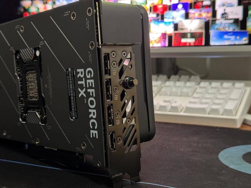 在电源接口部分,七彩虹iGame RTX 5080 AD OC采用的是16Pin的供电接口,从之前的12VHPWR升级成了更安全的12V-2×6,更利于用户拔插。此外,在供电接口旁边七彩虹还设计了灯光同步接口,配合附送的线材使用。在接口部分,七彩虹iGame RTX 5080 AD OC使用的是3×DP 2.1b+1×HDMI 2.1b的搭配,接口加上机身厚度超过三槽。自然的,七彩虹一键超频按键在这款产品上也延续下来,用户只要将按键按下,就能达到更高的加速频率,提升显卡的性能。