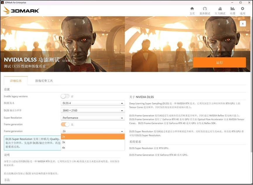在DLSS 4测试部分,我们一共测试四个应用及游戏,分别是3Dmark、《赛博朋克2077》、《龙腾世纪:影障守护者》以及《漫威争锋》。前两者都是原生支持DLSS 4,而后两个游戏则是可以在NVIDIA APP中进行设置,从而支持DLSS 4最新的模型和多帧生成功能。