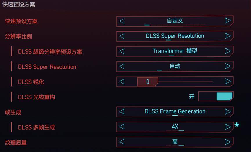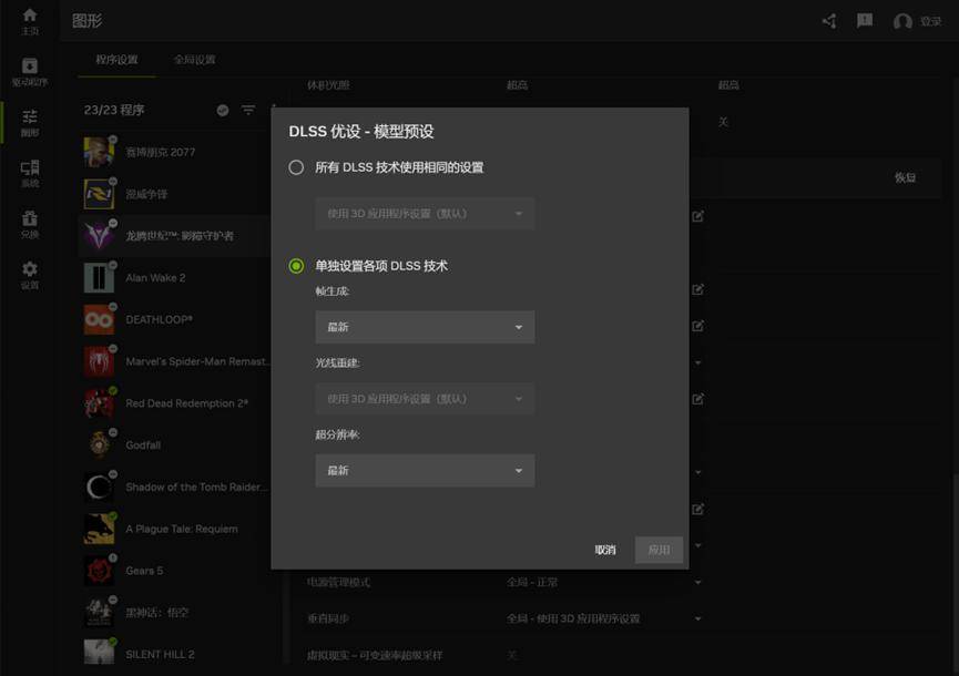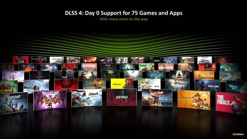 按照NVIDIA所说,在RTX 50系列显卡上市的时候,就会有75个游戏和应用对其进行支持。当然在我们测试的时候,部分游戏和程序才开始陆续支持DLSS 4,NVIDIA也提供了一些游戏的DLSS 4测试分支。在原生支持DLSS 4的程序和游戏中,我们可以选择多帧生成的倍率,比如2×、3×以及4×,某些游戏还可以让用户选择模型;而在一些非原生支持的游戏中,我们也可以利用NVIDIA APP的DLSS优设功能进行设置,让新的DLSS 4特性覆盖到游戏中,从而使游戏支持新的Transformer模型和多帧生成功能。