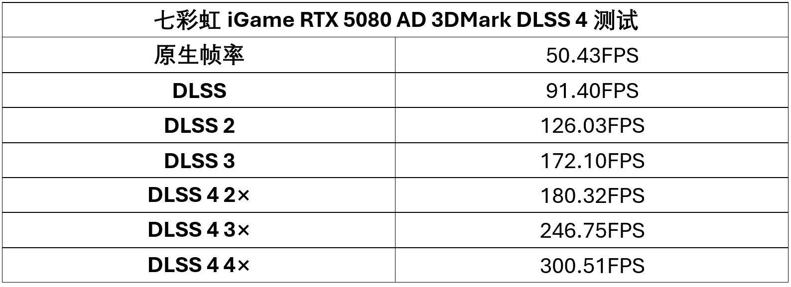 3DMark在DLSS这部分,我们率先体验了1.5版的变化,也就是支持了DLSS 4。在使用iGame RTX 5080 AD OC的时候,DLSS 4 4×帧生成比原生帧率高出了496%,这真是一个惊人的提升幅度。而如果和DLSS 3的帧生成相比,DLSS 4 4×帧生成也高出了74%,只能说DLSS 4的多帧生成的确很夸张!另外,即使在同为2×帧生成的前提下,我们对比了DLSS 3和DLSS 4的效率,DLSS 4依然要比DLSS 3更好一些,当然这在不同的游戏和应用中,可能会有一些变化。