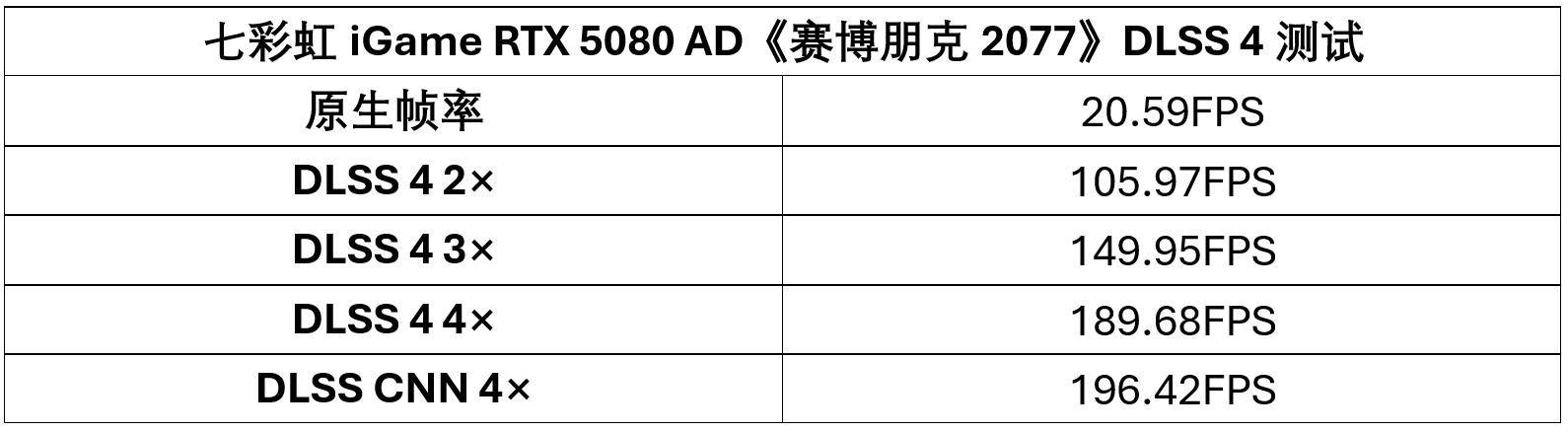 《赛博朋克2077》已经更新到2.21版,可以支持RTX 50的DLSS 4了。有趣的是,用RTX 50系列显卡,用户甚至可以选择模型,除了DLSS 4的Transformer模型之外,还可以选择CNN模型,而且也能支持4×多帧生成。使用iGame RTX 5080 AD OC之际,DLSS 4 4×在自动超分下,帧率高达189.68FPS,比原生的20.59FPS(路径追踪)提升高达821%,提升八倍的说法诚不欺我……基本我们可以认为,当下的任何游戏不管对硬件要求多苛刻,只要支持DLSS 4,那么RTX 5080都可以在超高的帧率下流畅运行。另外我们用CNN模型试了一下4×多帧生成,帧率居然比Transformer模型要高,但是画面对比则不如DLSS 4。