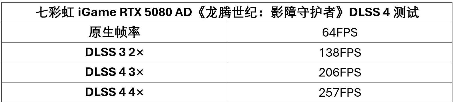 《龙腾世纪:影障守护者》并不是一款原生支持DLSS 4的游戏,不过更新到最新版本后,可以在NV APP中设置,用最新的DLSS 4去替换游戏中的DLSS设置。原始帧率只有64FPS,如果用DLSS 3的帧生成,iGame RTX 5080 AD OC则是138FPS,但如果用DLSS 4的4×多帧生成的话,帧率直接飙到257FPS,比原生帧率提升了300%,比DLSS 3的帧生成提升了86%,考虑到这不是原生支持DLSS 4的游戏,这个提升效率足够让人吃惊了。
