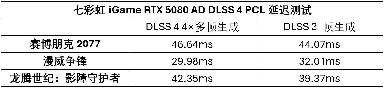 我们最后在iGame RTX 5080 AD OC上测试了一下两种不同DLSS技术的延迟区别,因为我们其实比较担心多帧生成会让平均PC延迟有明显的提升,但我们在三个游戏中进行测试,发现DLSS 4的多帧生成在平均PC延迟上,和DLSS 3帧生成其实没有太大的变化,有两个游戏稍微高点,一个游戏稍微低点,但应该都不会对玩家产生很明显的影响,所以大家不用为这个问题担心。