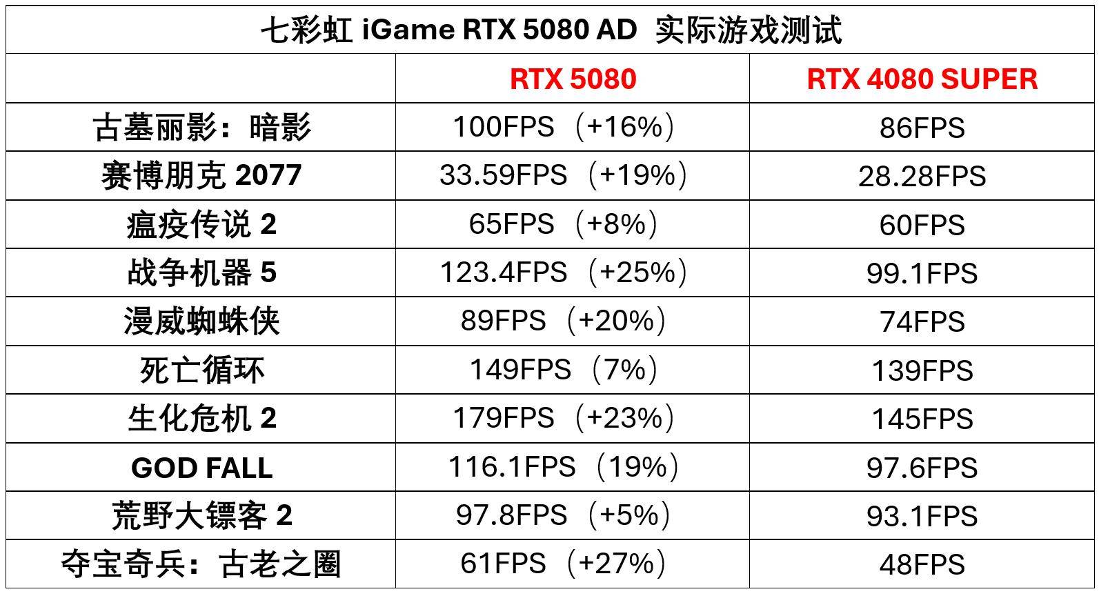 实际上相比价格较高的RTX 5090D,RTX 5080可能会是更适合高端玩家的一款显卡,从测试的结果来看,RTX 5080相比上一代同定位的产品,即使不考虑DLSS 4的加成,在游戏性能上的提升也是非常明显的,综合来看比RTX 4080 SUPER强出17%左右,当然我们也强调了,这其中多少是因为七彩虹iGame RTX 5080 Advanced OC 16GB显卡一键超频“附赠”了一些性能,RTX 5080公版应该没这么强。