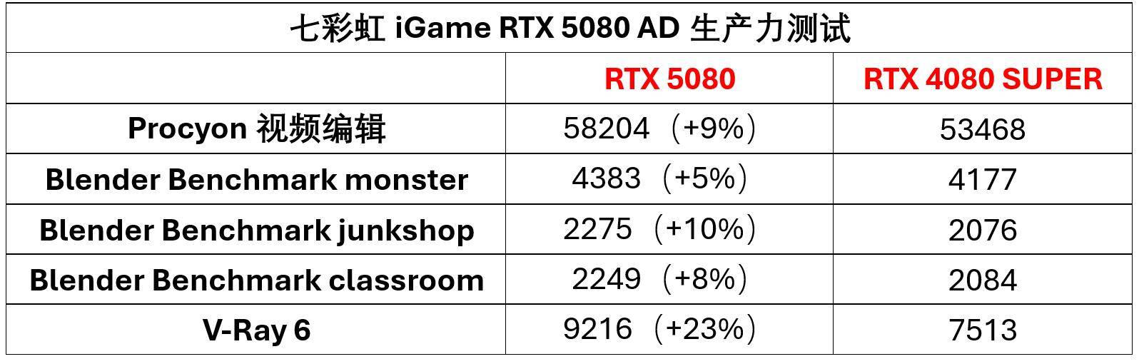 Procyon视频编辑是专门针对编解码的测试程序,七彩虹iGame RTX 5080 AD OC比RTX 4080 SUPER要强出9%左右;而在针对3D渲染的两个程序中,iGame RTX 5080 AD OC的提速都很明显,Blender Benchmark平均下来比RTX 4080 SUPER快出8%左右,而在V-Ray 6中则快出23%。在生产力这部分,iGame RTX 5080 AD OC显卡相比上一代同档次显卡的进步还是有目共睹的。