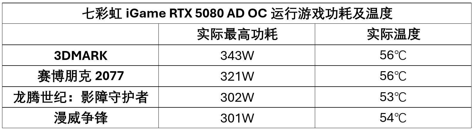 从实际的游戏和程序运行情况来看,七彩虹iGame RTX 5080 AD OC显卡比拷机要更好,我们在3DMark中实际达到的最高功耗为343W,实际温度只有56℃,而在其他游戏中,即使是设定为4K最高画质,显卡的功耗实际也不高,像运行赛博朋克2077的功耗仅有321W,其他游戏也只有300W左右,温度也不高,远远低于公版RTX 5080运行游戏时的核心温度。