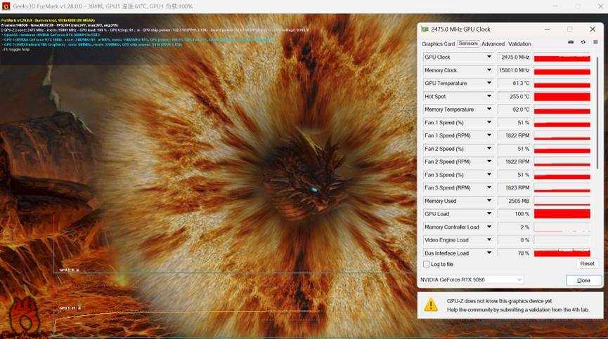 在温度功耗部分,七彩虹iGame RTX 5080 AD OC的表现相当不错,尽管这是一款非公版显卡,而且加速频率要高出公版,但在温度功耗部分的控制上却做得相当不错。在显卡待机状态下,核心温度保持在36℃左右,风扇支持智能启停技术,并不转动。Furmark拷机测试时,拷机十分钟后,七彩虹iGame RTX 5080 AD OC的核心温度仅在63℃左右,风扇速度控制在55%,转速在1900RPM左右,整机功耗最高370W,比公版额定的360W高出10W左右。