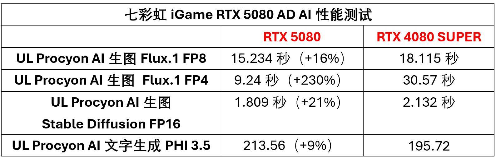在AI性能部分,iGame RTX 5080 AD OC的表现明显强于上一代的RTX 4080 SUPER,只是不同项目的领先幅度有所不同。这里特别要注意的是FP4下的AI生图,RTX 5080的确是大幅领先,这显然是因为Blackwell添加了对FP4的支持,所以iGame RTX 5080 AD OC直接比RTX 4080 SUPER强出200%以上。