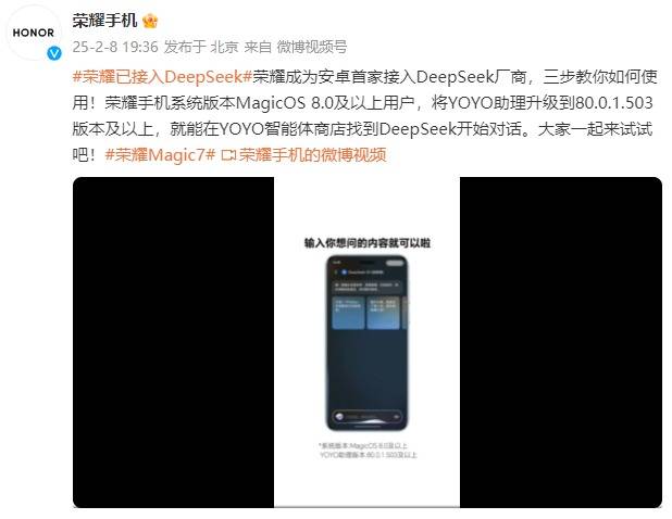 — 央视报道“DeepSeek接入潮”,荣耀成为首家接入DeepSeek的安卓厂商! —