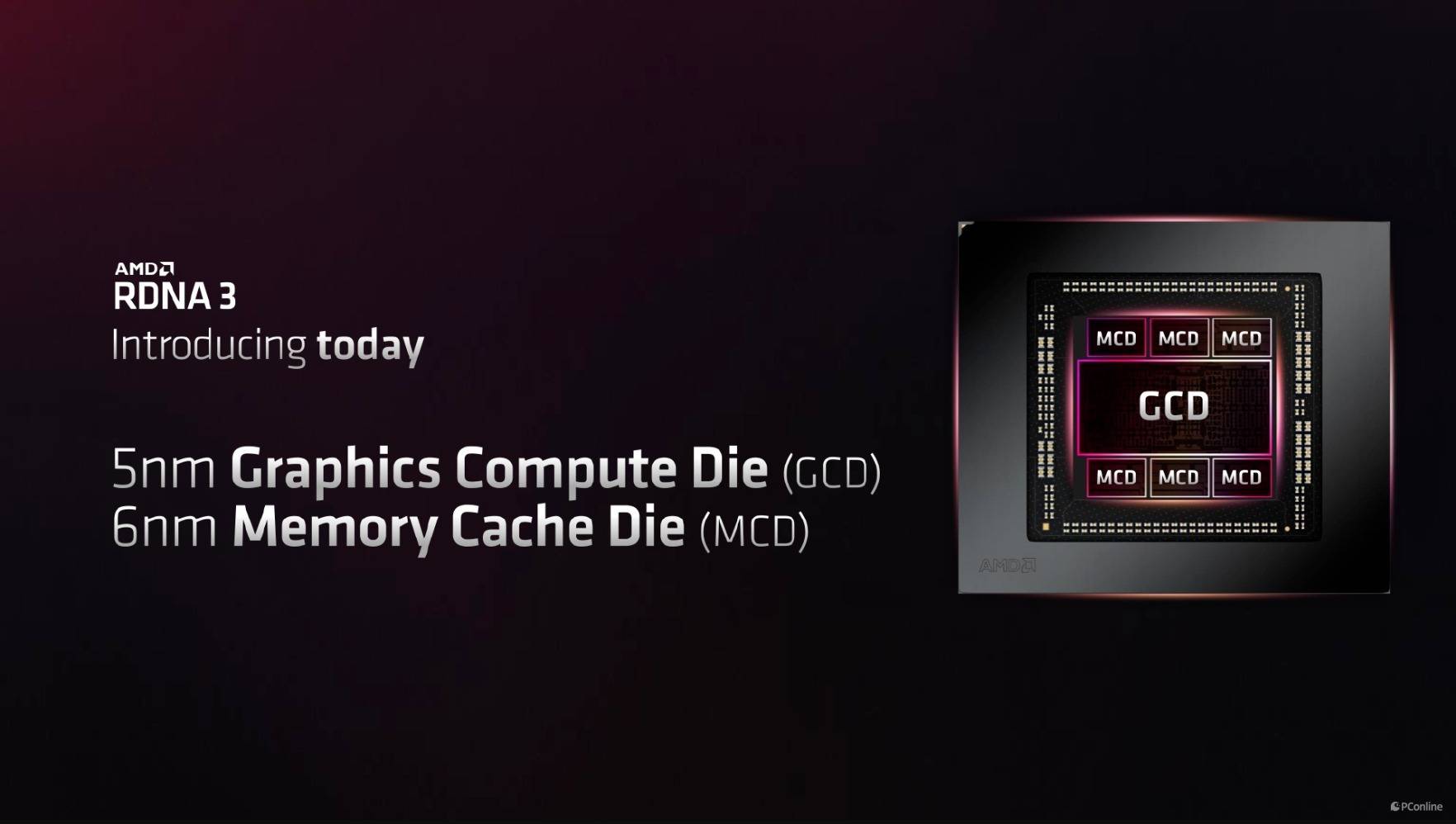 讲完了规格,再讲讲这代显卡究竟还有哪些升级点。这次RDNA 3架构最大的特点当然就是它的Chiplets胶水设计了。此前AMD已经在锐龙和霄龙处理器上用过类似的技术,现在这项技术应用在了RX 7000系的核心上,像RX 7900 XTX和RX 7900 XT上的Navi31核心,GCD就采用5nm的工艺, 6个MCD则采用了6nm的工艺。