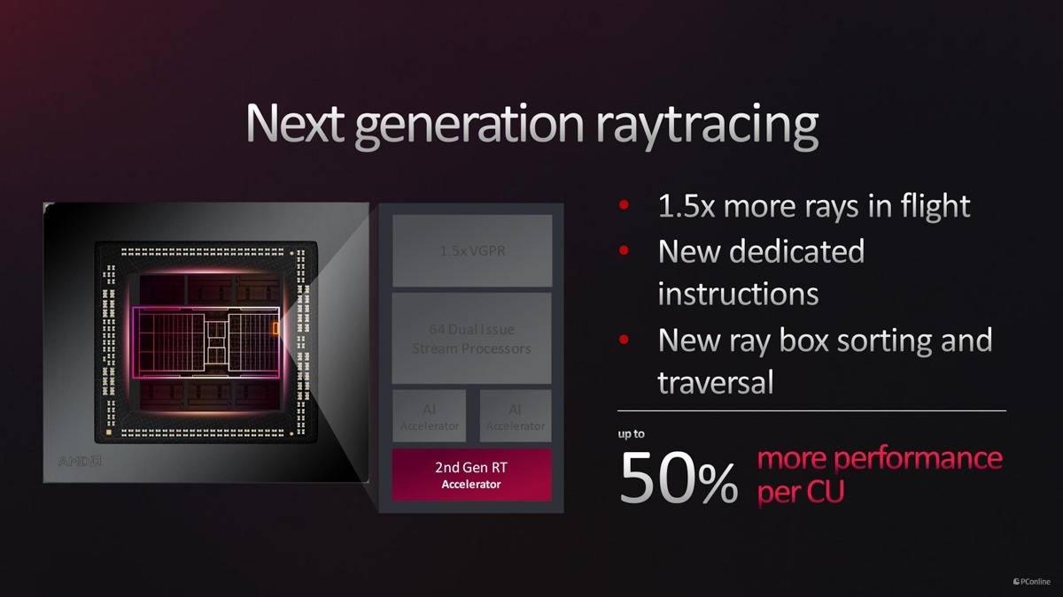 RDNA 2架构上AMD首次加入了光追特性,但当时的光追特性还远不足以跟老黄抗衡,现在RDNA 3的计算单元中配备了进一步增强的第二代光线加速器,通过各种硬件与软件优化,满足最新光追游戏与应用的需求。