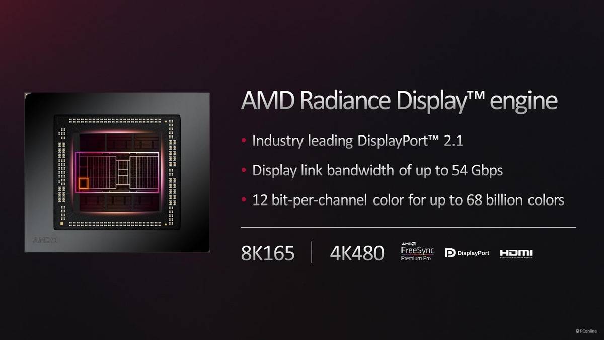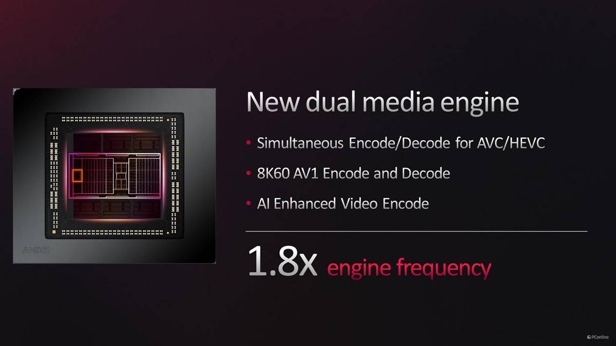 并且这款显卡还支持了时下热门的AV1编解码技术,为了支持最新的媒体格式,AMD还给这两张显卡加入了全新的双媒体引擎(Dual Media Engine),它支持AVC跟HEVC2个同步解码或者同步编码的直播。相比上代RDNA2架构的显卡,这一代在编解码效率上是前代的1.8倍,几乎能够节省一半的时间。