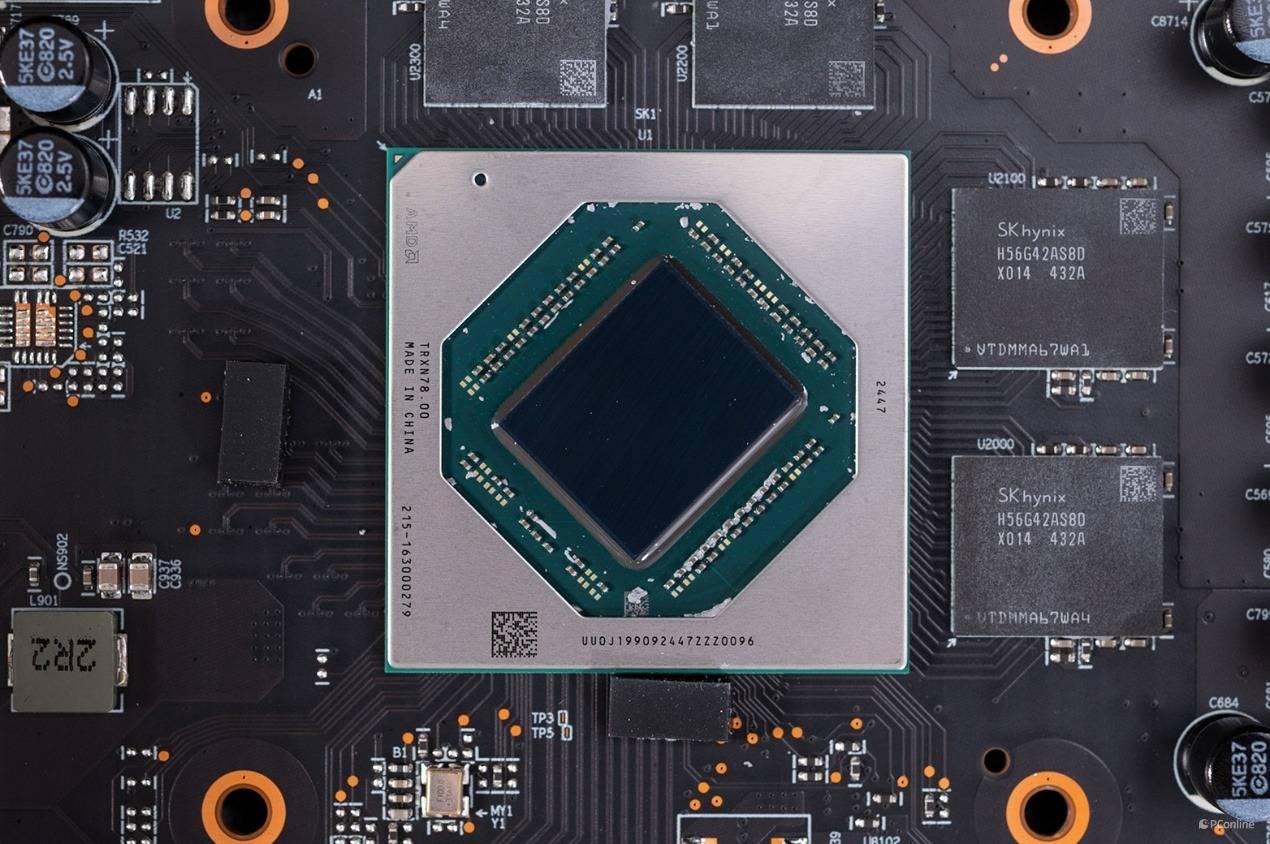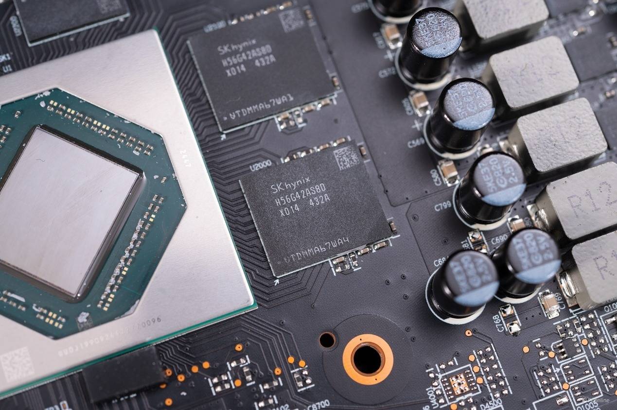 核心四周是四颗GDDR6显存颗粒,来自SK海力士,编号为H56G42AS8DX014,最高速率为18Gbps,单颗容量为2GB,位宽为32-bit,共同组成8GB显存,128-bit位宽。