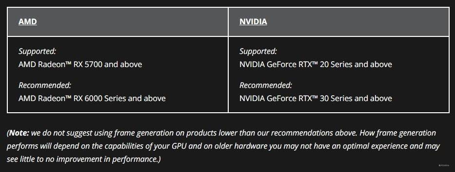 还有正如我们上面所说,FSR 3同样支持A卡与N卡,按照官方介绍,FSR 3支持Radeon RX 7000、6000 甚至更旧的显卡,N卡则是RTX 20系以上都支持,老黄不让你用帧生成,AMD让你用!