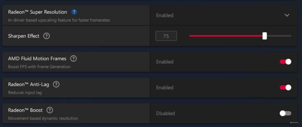 除此之外,AMD还有黑科技,就是AMD Fluid Motion Frames(AFMF)与Radeon Super Resolution(RSR),前者是帧生成技术,而后者则是超级分辨率技术,它可以将低分辨率渲染的游戏画面增强后放大,以显示器原始分辨率显示输出。。