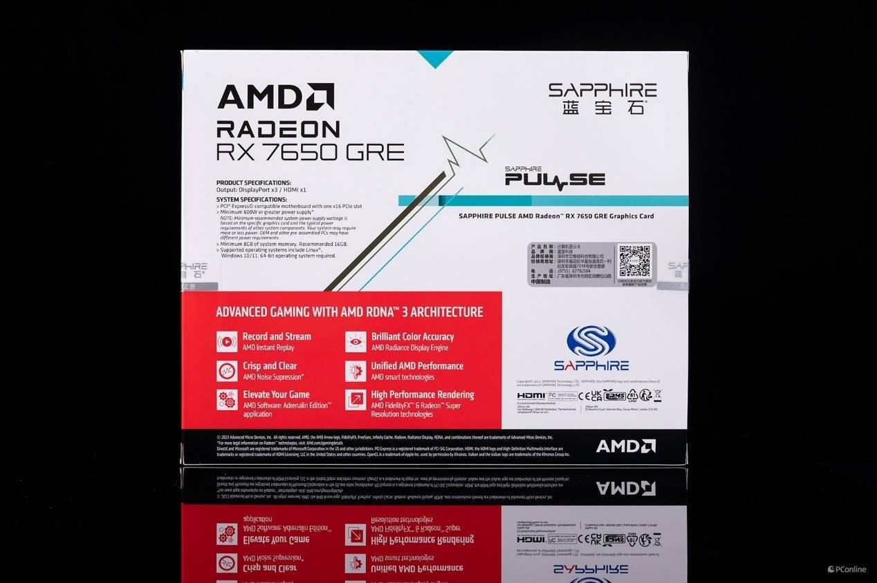 包装盒的背面还是熟悉的味道,玩家可以在这提前了解到蓝宝石AMD Radeon RX 7650 GRE 8G D6白金版的详细规格。