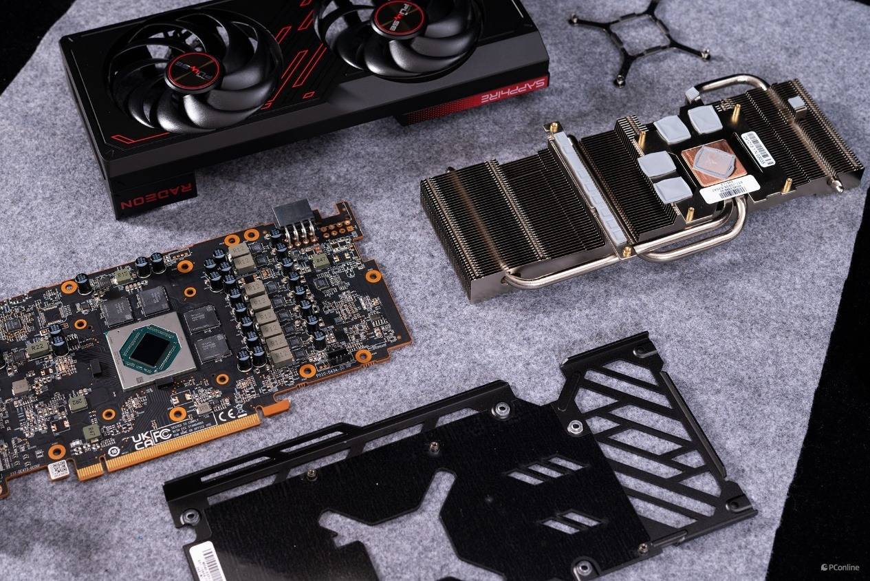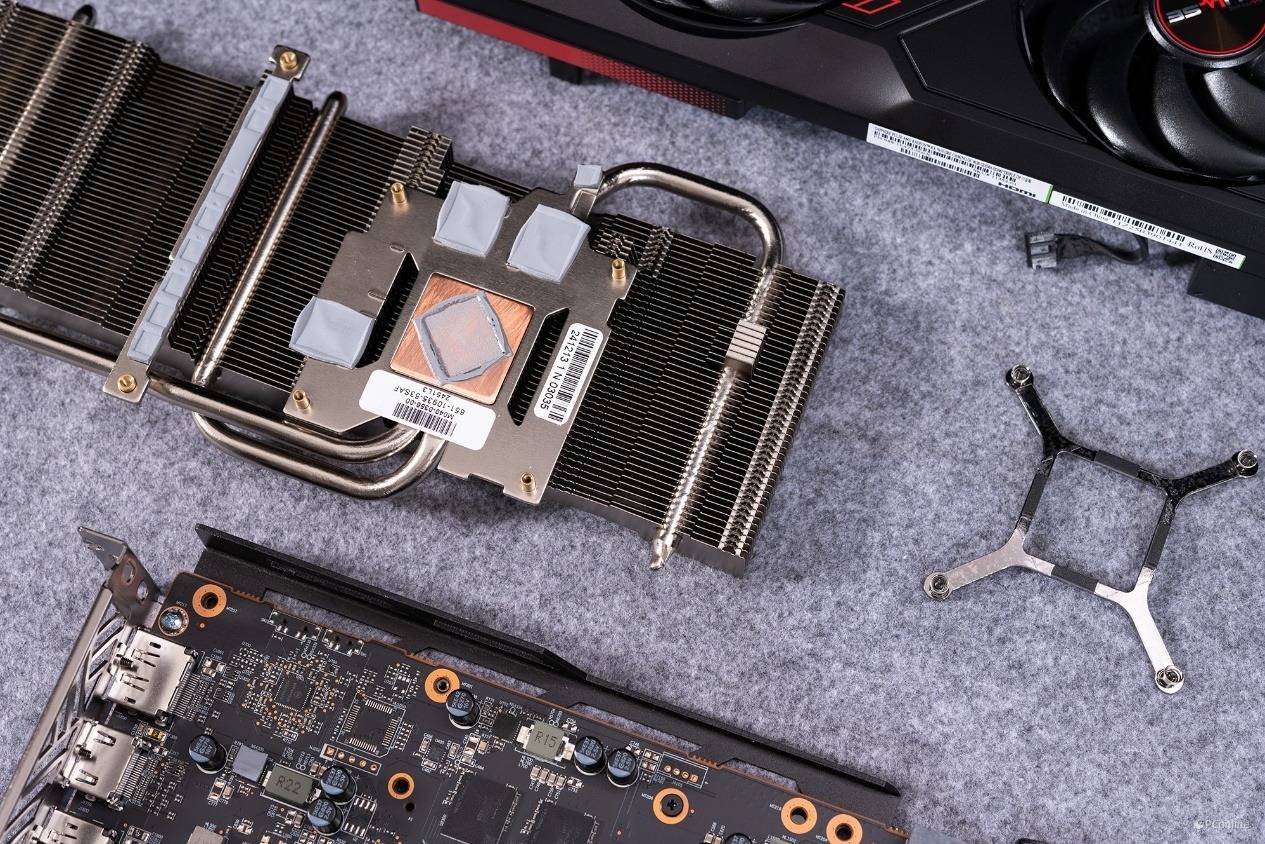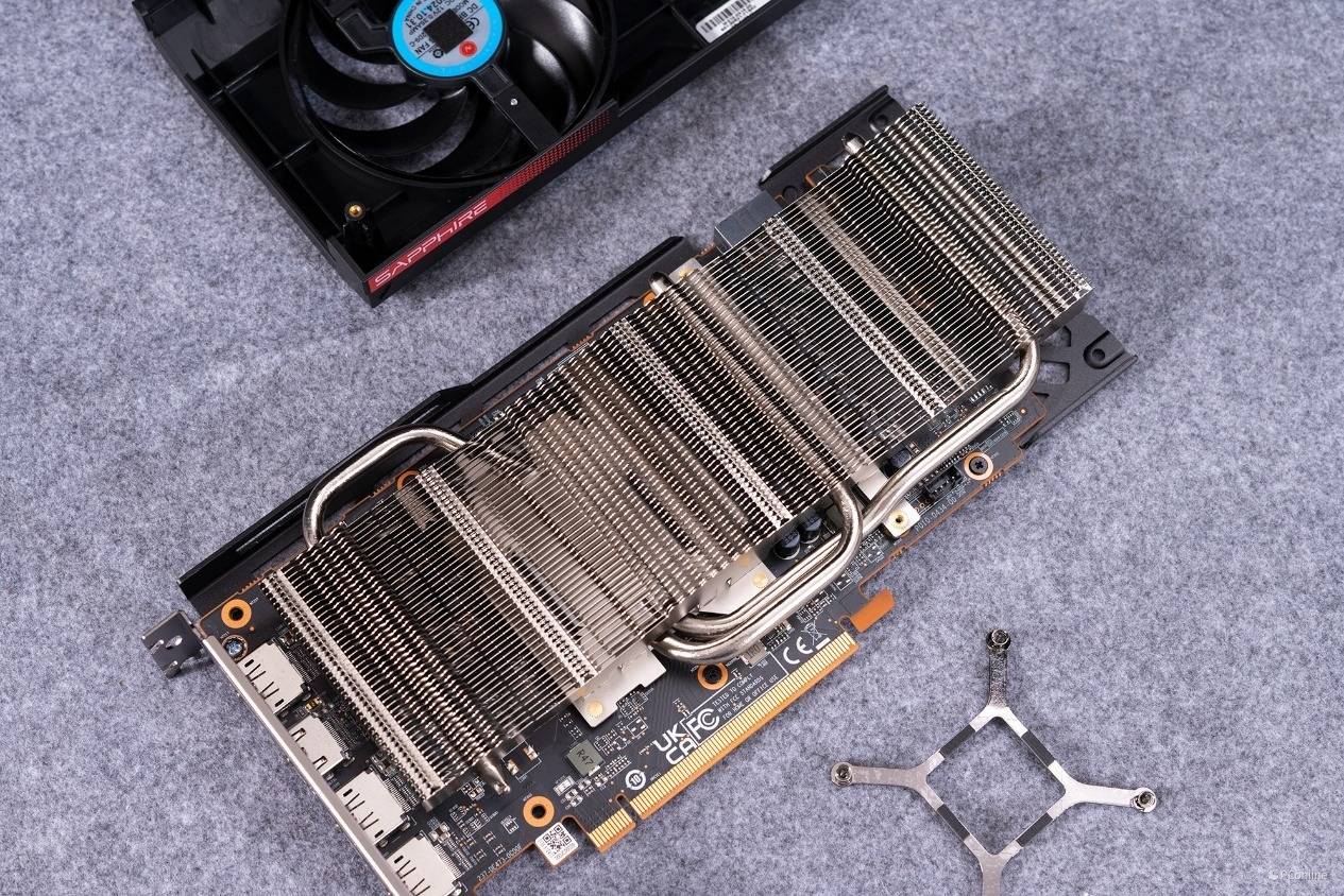 接下来上拆解!蓝宝石AMD Radeon RX 7650 GRE 8G D6白金版的拆解还是十分简单的,卸下背板上的螺丝就可以将散热风扇模组取下。再卸下背板上的扣具,则可以将整个散热模组取下。