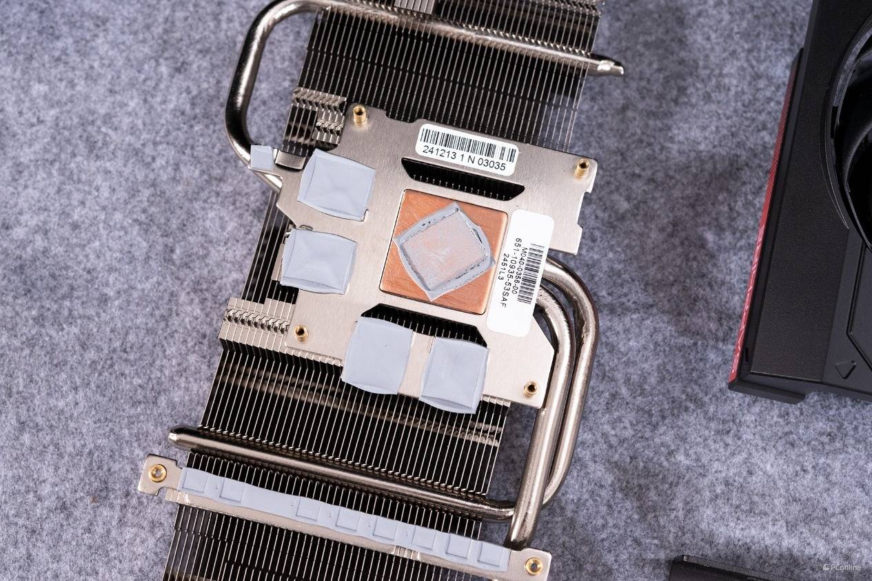 散热模组采用铜底直触设计,显存和供电DrMos芯片上覆盖有高导热系数的硅脂,能够有效传导热量。