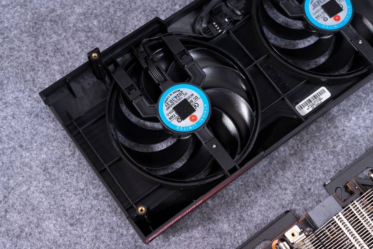 主动散热部分则是我们刚刚见过的两把滚珠轴承刀刃式轴流扇,风扇做了不错的动平衡处理,在使用过程中能感受到风量和噪音都控制在一个较为出色的水准。