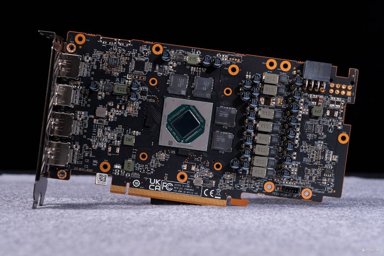 供电结构为外置单8Pin结构,应对170W的功耗绰绰有余了。底部则是PCIe接口,标准PCIe 4.0×16接口,速率为PCIe 4.0×8,当然这对于一张入门级甜点卡来说完全够用了。